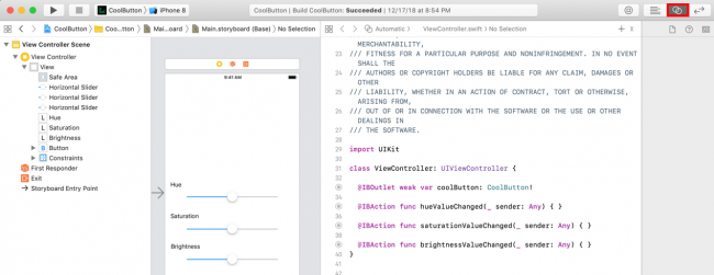 现在,再次打开Main.storyboard并在顶部栏中选择Assistant Editor以并排显示ViewController.swift和Main.storyboard。