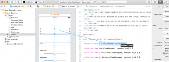按住control键从View Controller Scene ▸ ViewController将按钮拖动到左侧并将其连接到coolButton outlet。