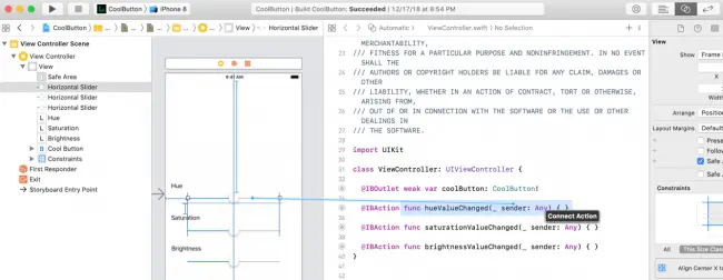 @IBAction func hueValueChanged(_ sender: Any) { }