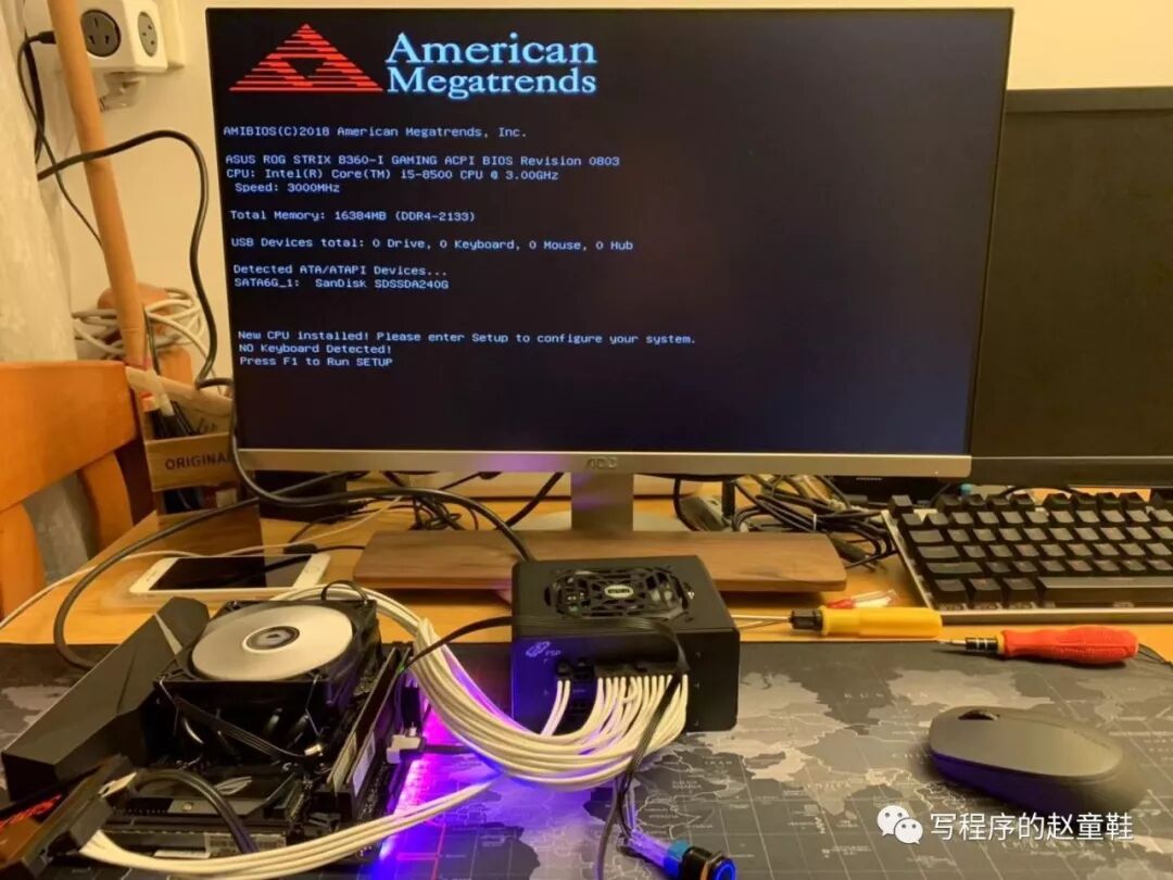 把CPU、电源、主板、系统盘接上后就可以进行开机测试了,这个主板自带了RGB灯光,还是很炫的。是不是有一种一按下去就会爆炸的感觉呢?