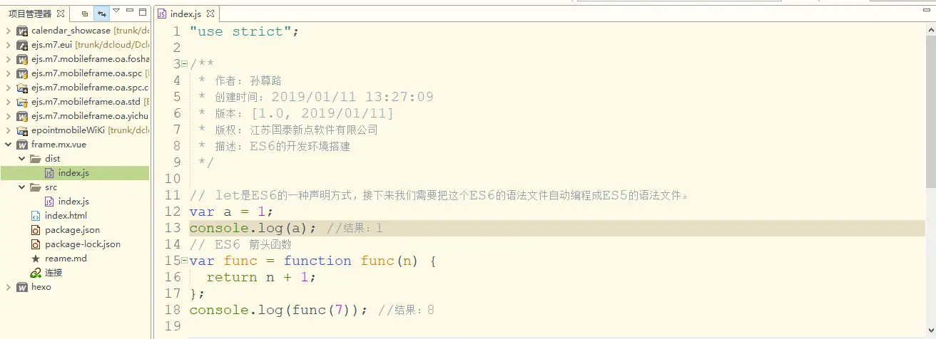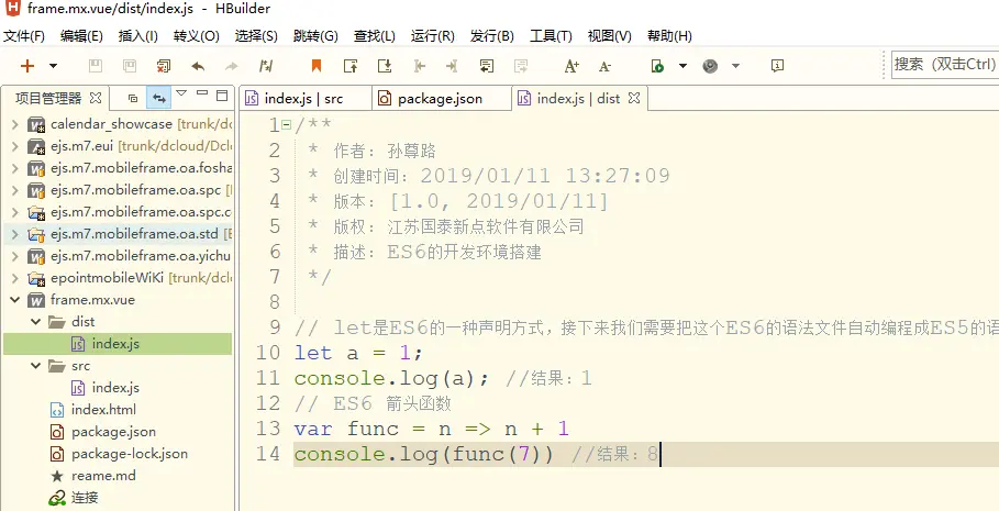 你会发现,在dist目录下确实生产了index.js文件,但是文件并没有变化,还是使用了ES6的语法。因为我们还需要安装转换包才能成功转换,继续往下看吧。