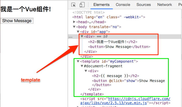 Vue将会通过其自身的编译机制(如前图所示的过程),将<my-component>编译成让浏览器可以识别的HTML代码。可以借助浏览器开发者工具一探究竟: