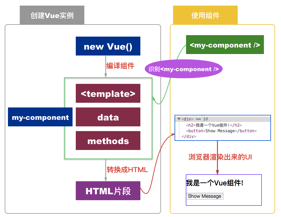 我的理解是这样的。上面的示例通过new Vue()创建一下人Vue的实例,并且将这个实例挂载到div#app的元素下,然后把组件<my-component>编译成HTML,最终渲染所需要的UI效果。继续用张图来描述这个过程,一图胜过千言万语嘛。
