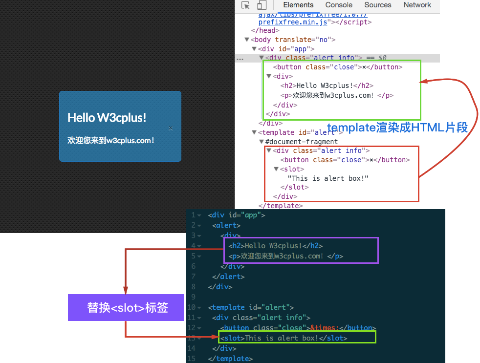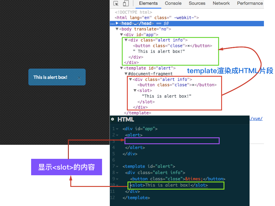 接下来,在上面的示例上,做小小的修改,在<alert>使用的时候,插入你想要的内容(也就是指父组件向模板分发内容):