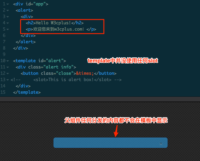 从代码运行的结果可以得知:父组件给模板分发了内容,则分发的内容会替换slot标签。除此之外,假设模板中未设置插槽,父组件依旧向其分发了内容,但最终任何分发的内容都不会显示。比如下图所示:
