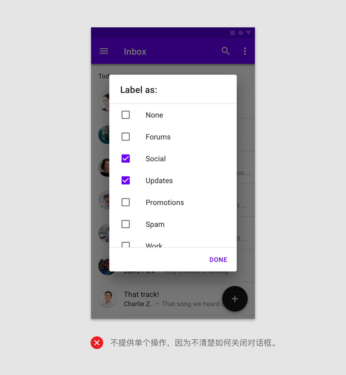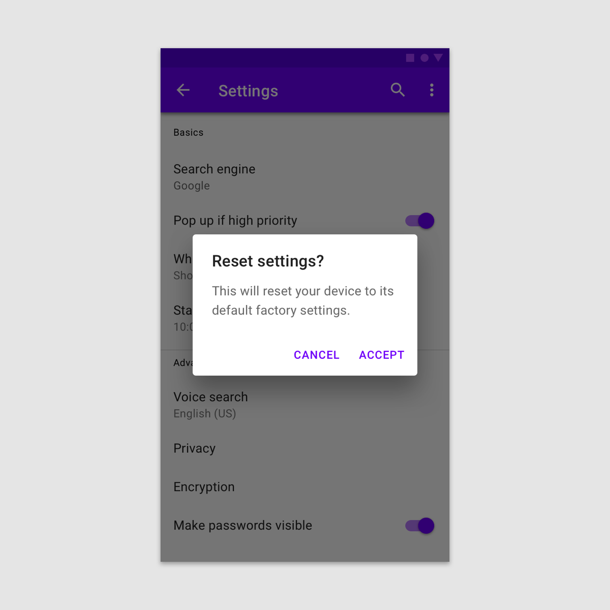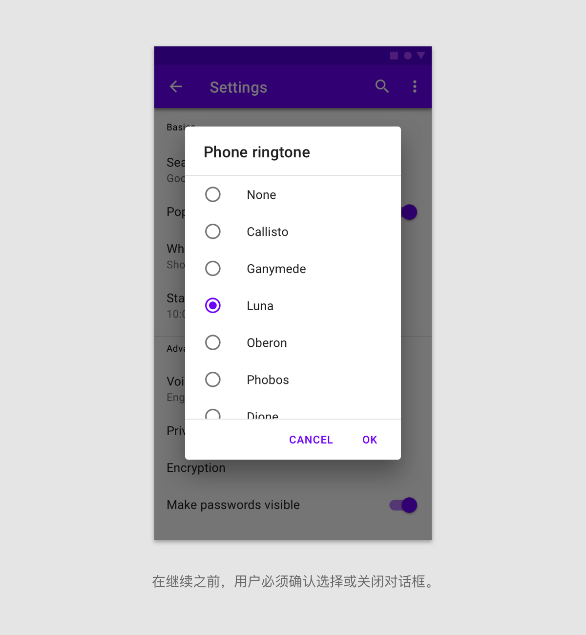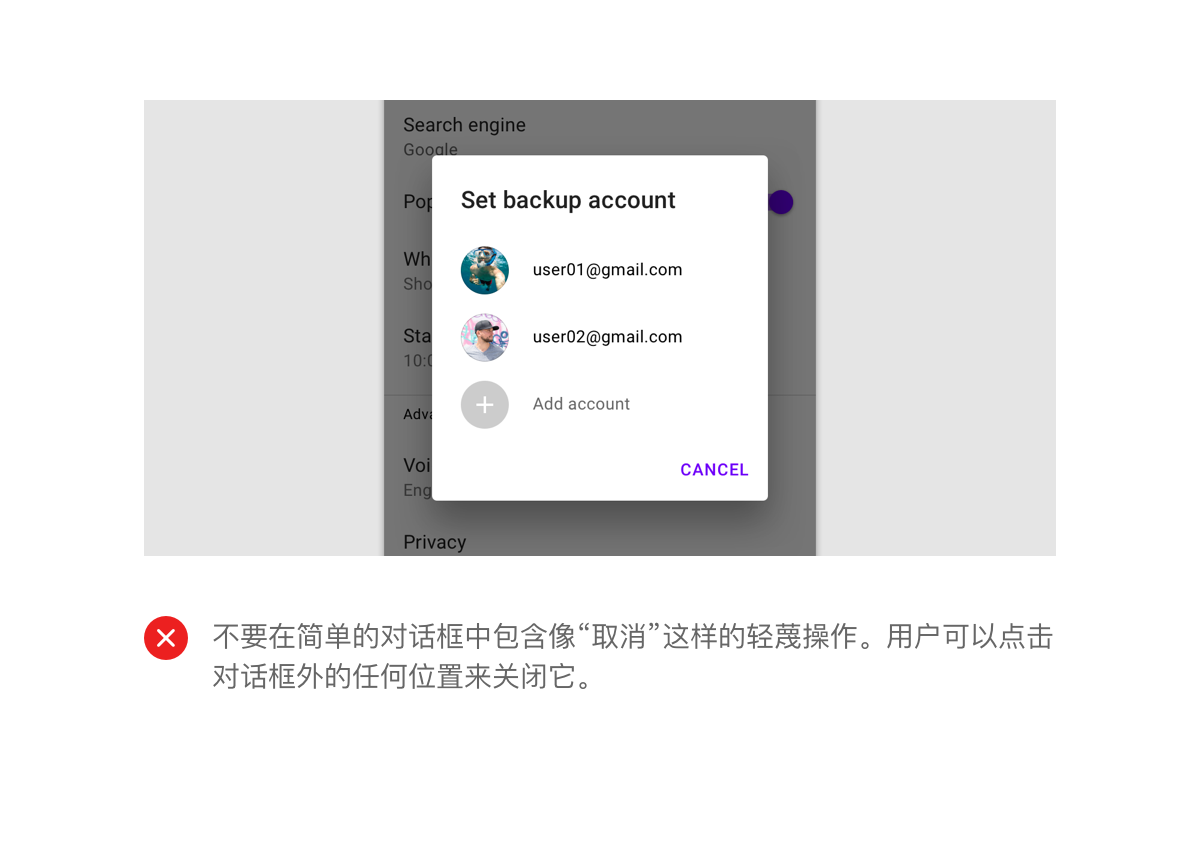 对话框保持关注,直到被取消或采取行动,例如选择设置。它们不应被其他元素遮挡或部分显示在屏幕上,除了全屏对话框。