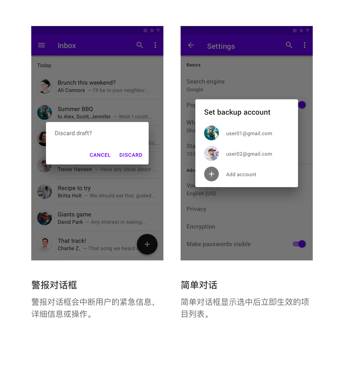 对话框显示在24dp高度,可以显示阴影。它们出现在其他内容的上方,通常在其下方有一个覆盖所有应用程序内容的遮罩。