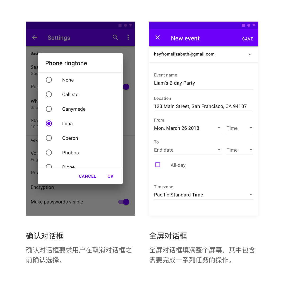 全屏对话框将一系列任务分组,例如创建包含事件标题、日期、位置和时间的日历条目。因为它们占据整个屏幕,所以全屏对话框是唯一可以显示其他对话框的对话框。