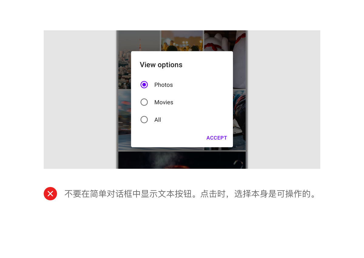 简单对话框可以显示在选中时可立即操作的项目。他们没有文字按钮。