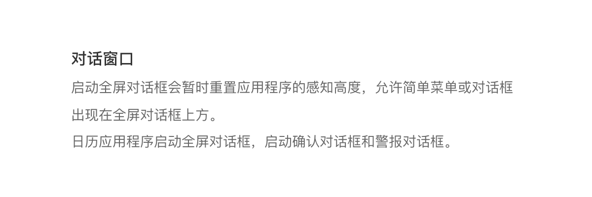 对话框是出现在应用程序内容前面的一种模式窗口,用于提供关键信息或要求做出决定。对话框在出现时禁用所有应用功能,并保留在屏幕上,直到确认、取消或执行必要的操作为止。