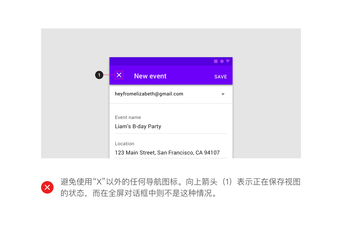 由于全屏对话框只能完成,关闭或关闭,因此只能使用关闭的“X”导航按钮。