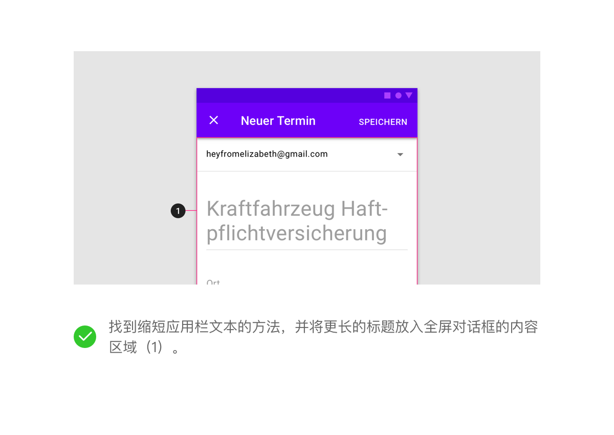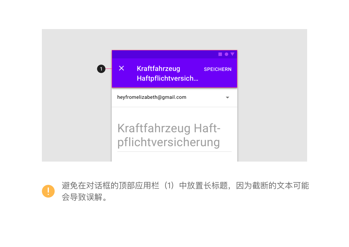 标题应该简洁。如有必要,它们可以换行到第二行,并被截断。如果有长标题或可变长度的标题(例如注释),请将它们放在内容区域而不是应用栏中。
