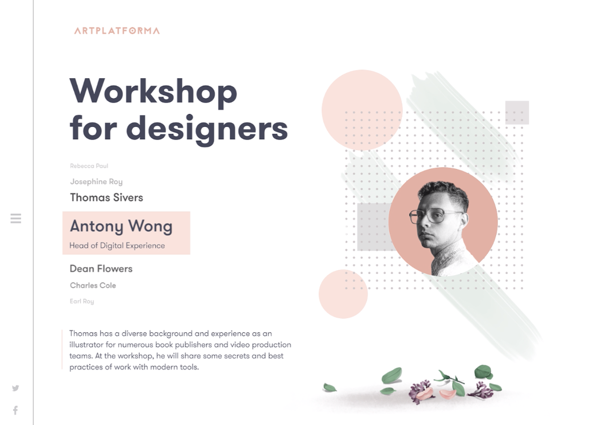 这是一个会议的登陆页面,插图画家和数字艺术家分享他们的经验。自定义英雄插图和它的动画使网页设计吸引人和原创。