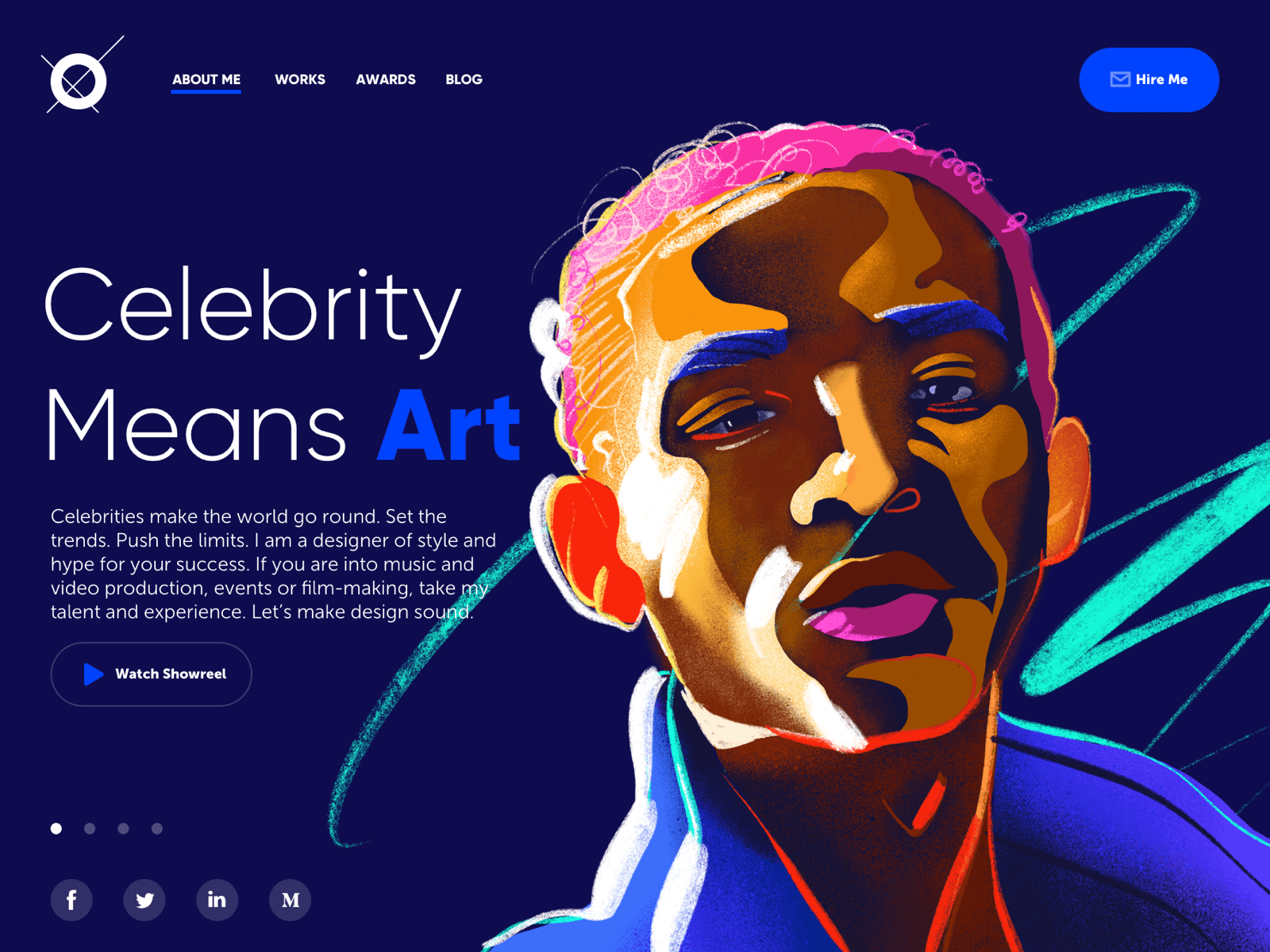 这是一个设计师的投资组合网站的概念,专门为名人,娱乐,音乐和电影制作项目。 深色背景与自定义英雄插图相结合,看起来更生动,并与音乐会舞台的氛围相关联。