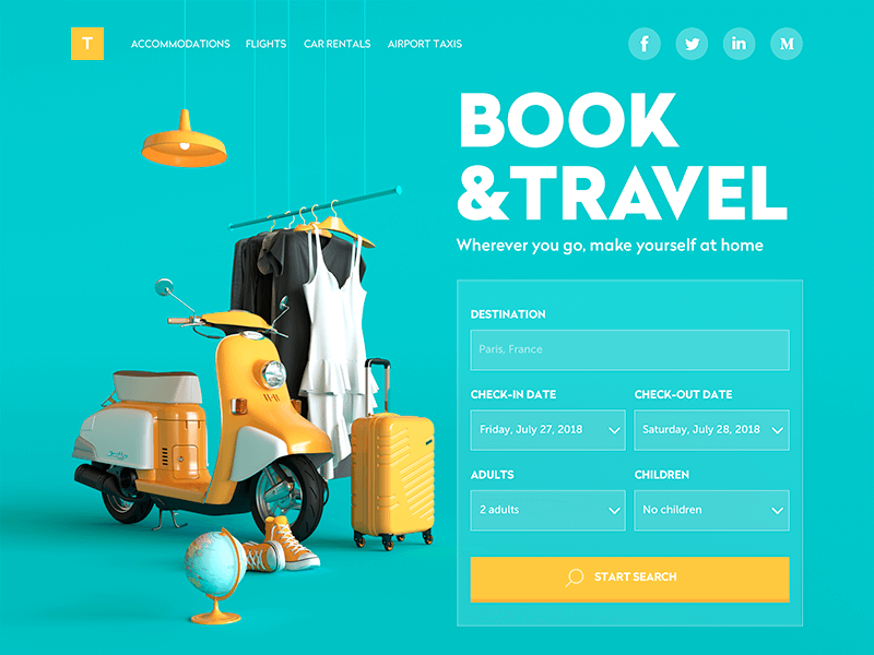 这个预订服务网站使用3D图形作为一个大的主题图像,它占据了页面的左侧部分并立即引起用户的注意。艺术品不仅设定了主题,而且使界面美观。