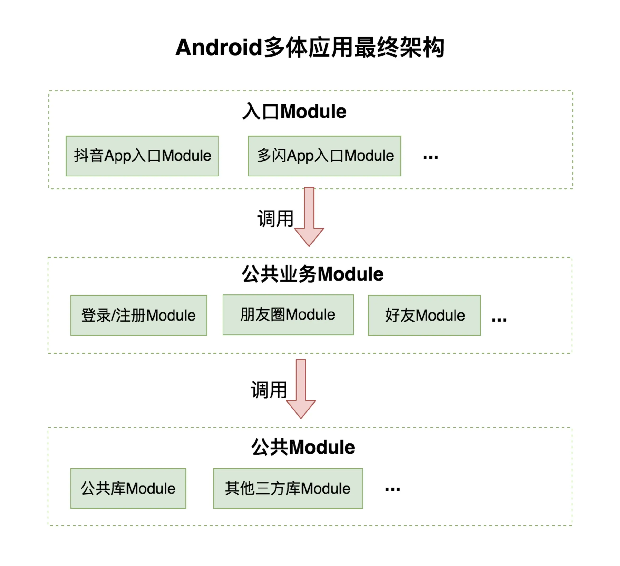 - 业务Module可以调用Library Module,业务Module之间不能相互调用,也但不能调用App入口Module,目的是保持单向调用流程