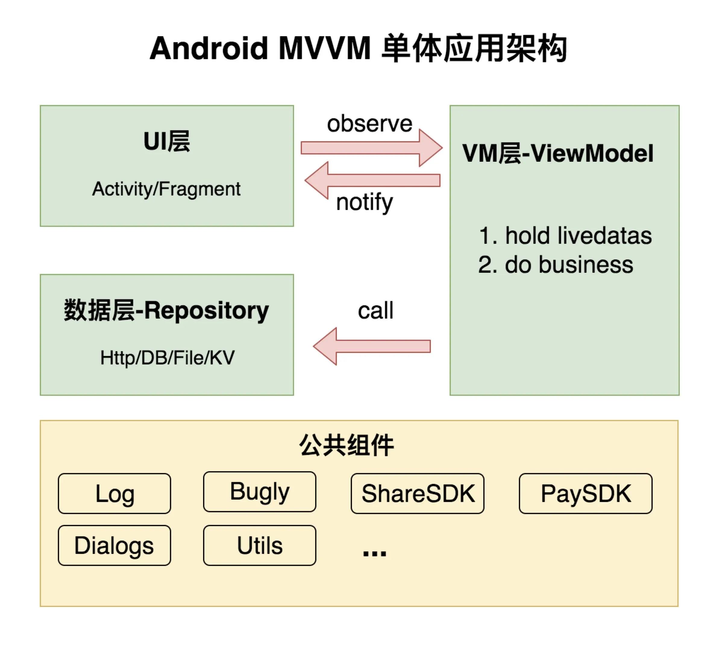 最开始,大家刚接触Android开发,统统是MVC。MVC的问题是布局文件作为View层,无法承担任何业务逻辑;UI的逻辑和业务逻辑都写在Activity层,在项目体量不大的时候这样完全没有问题。可是当每个页面的业务逻辑变成之前的2倍的时候,代码量也会增长一倍,这大大降低了项目的扩展性和维护性。这个时候可能你会通过抽取重构的方式来缓解这种局面,可是随着业务增多,不久又会陷入这种局面。