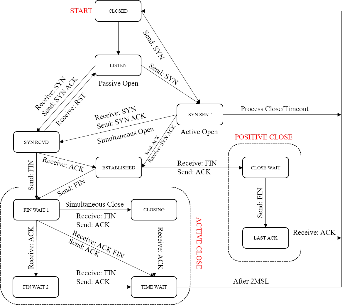 - 若想主动通信,发送SYN到SYN SENT状态。