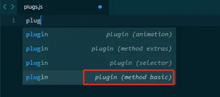 安装成功后在 js 文件中输入 plugin ,会出现下图所示内容: