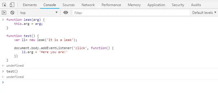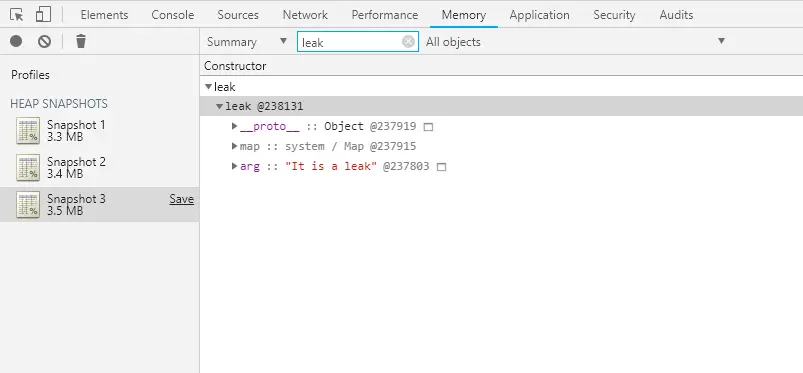 - 我们可以使用chrome浏览器调试工具中的内存快照,点击左上角灰色原点就可以保存一份快照,记录此时内存使用情况 可以看到代码中明显的l1对象被引用导致无法释放,在快照中我们也看到了一个leak实例在内存中。通过见=简单分析就可以知道是哪块代码出了问题