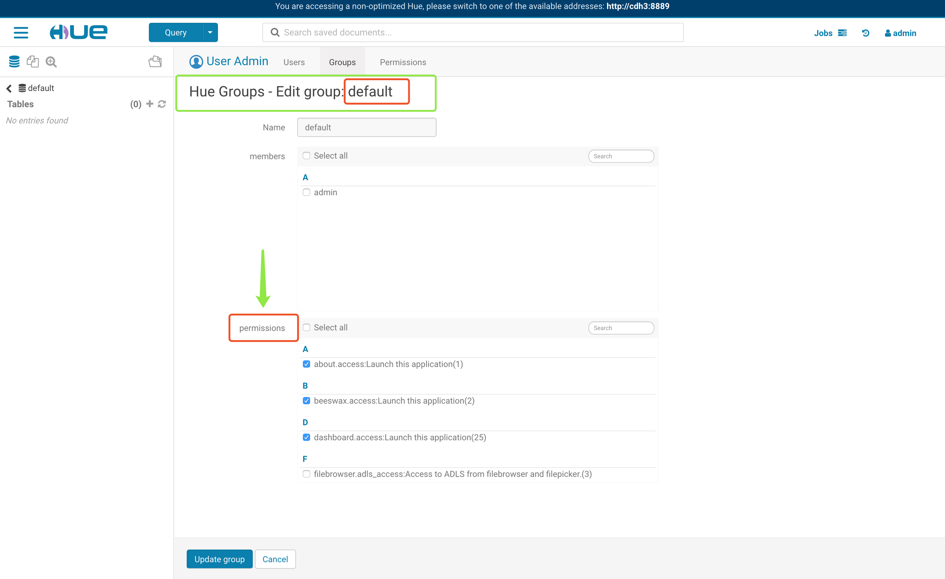 HUE服务后采用Hive用户去登陆,在左侧菜单找到sentry