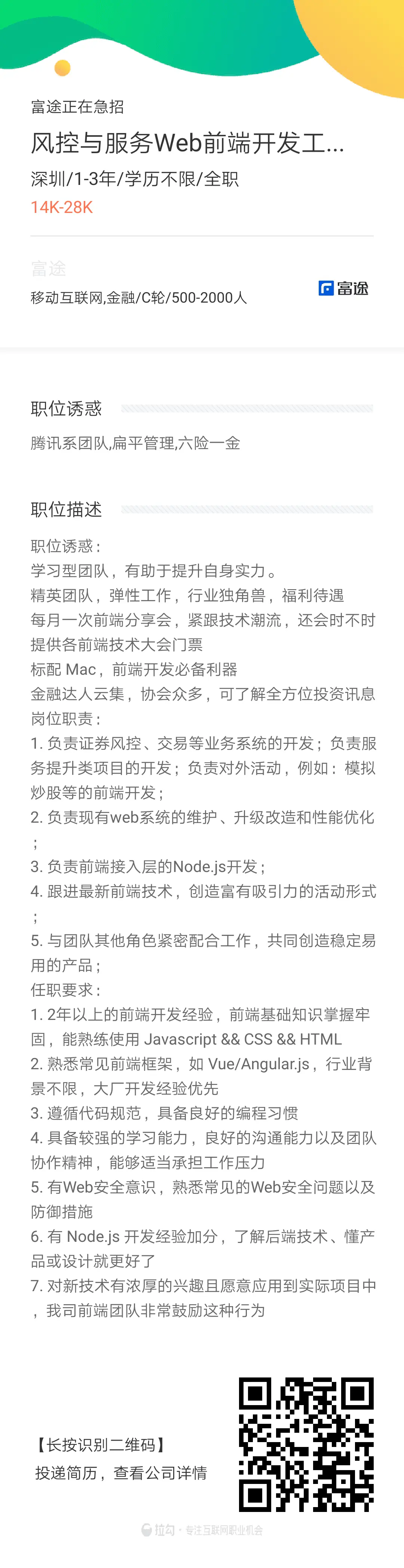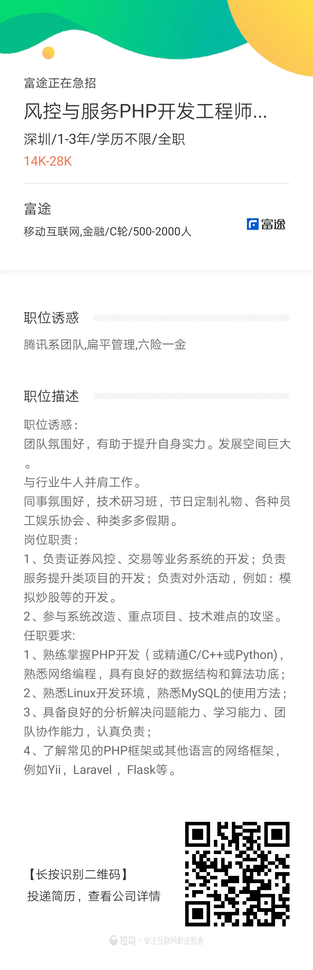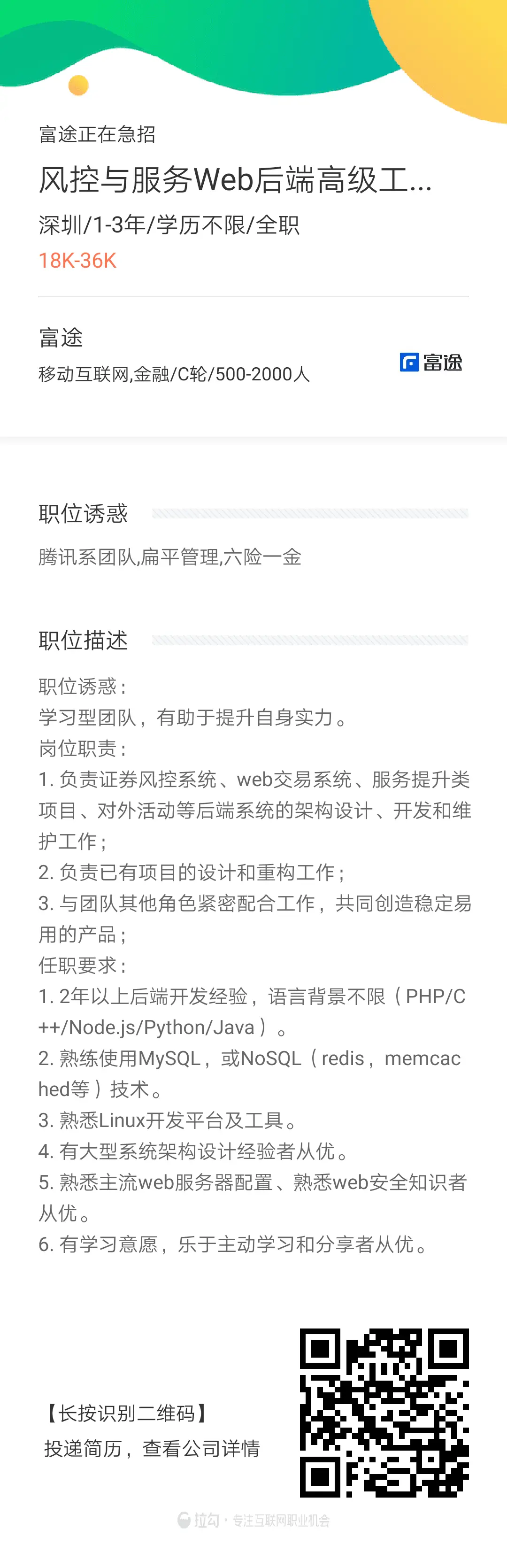 互联网券商独角兽,富途公司正在急招web前后端工程师,欢迎投递简历。
