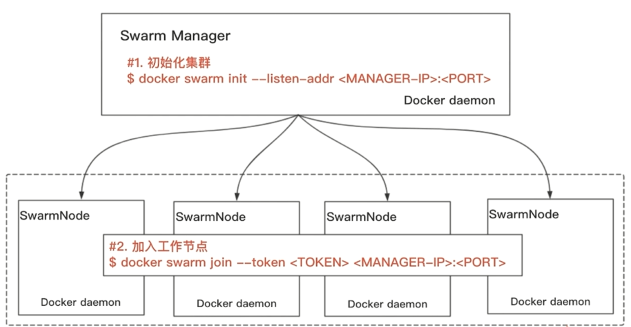 想想之前学习的mesos,需要先安装docker,Marathon,zookeeper,加入我们现在有5台liunx服务器,每个上面都装有docker,选择一台作为manager,上面执行下图的第一条命令, 执行完之后会打印出来一个token作为dockerSwarm的凭证,然后在每个worker节点下执行第二条命令,表示要加入集群,只需要token和对应manager节点的ip和端口号,集群环境就搭建完毕了