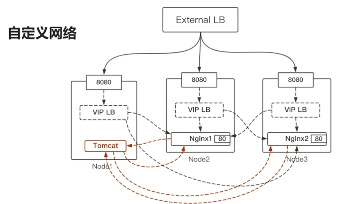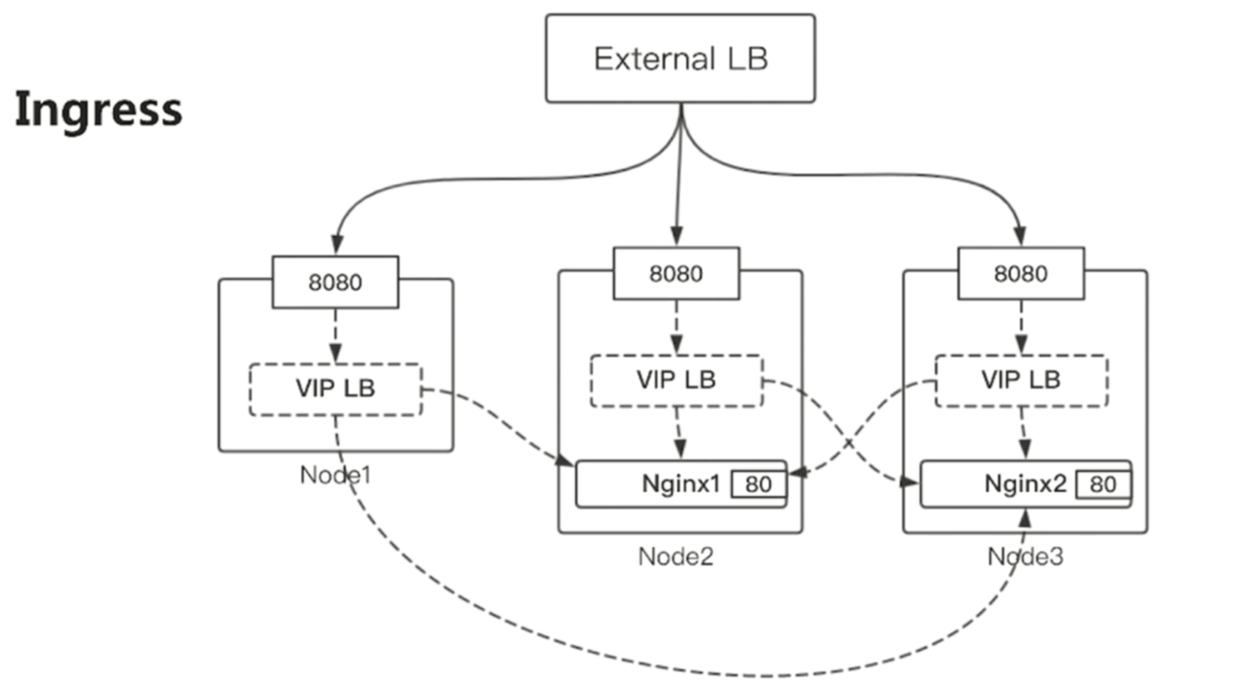 PS:假定运行了一个nginx服务2个实例,nginx1 和nginx2,容器内的端口是80,主机内的端口是8080, 这2个容器分别运行在node2和node3上,看到了吧node1虽然没有运行实例但是依然有8080端口在监听,一个集群在所有的worker节点上都是可以访问到的,随便选一个节点输入它的ip和8080端口就可以访问到,或者搭建一个负载均衡External LB,负责轮询的方式访问每个上边的8080端口,为什么在每个节点上都可以访问我们的服务呢?每个服务启动后所有的节点都会更新自己的VIP LB,把新的服务端口号和服务的信息建立一个关系,VIP LB是基于虚拟IP的负载均衡,VIP LB可以通过虚拟IP解析到真实IP,然后访问到服务。