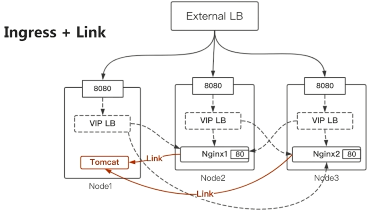 Ingress 支持外部访问,Ingress+ link和自定义网络只能容器间进行访问。