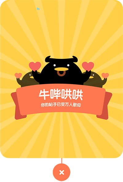 这个弹框的背景如下:当你的帖子被赞数到达500个以上,系统就会出现一个提示,告诉你“你很屌,你的帖子收到了万人崇拜”。
