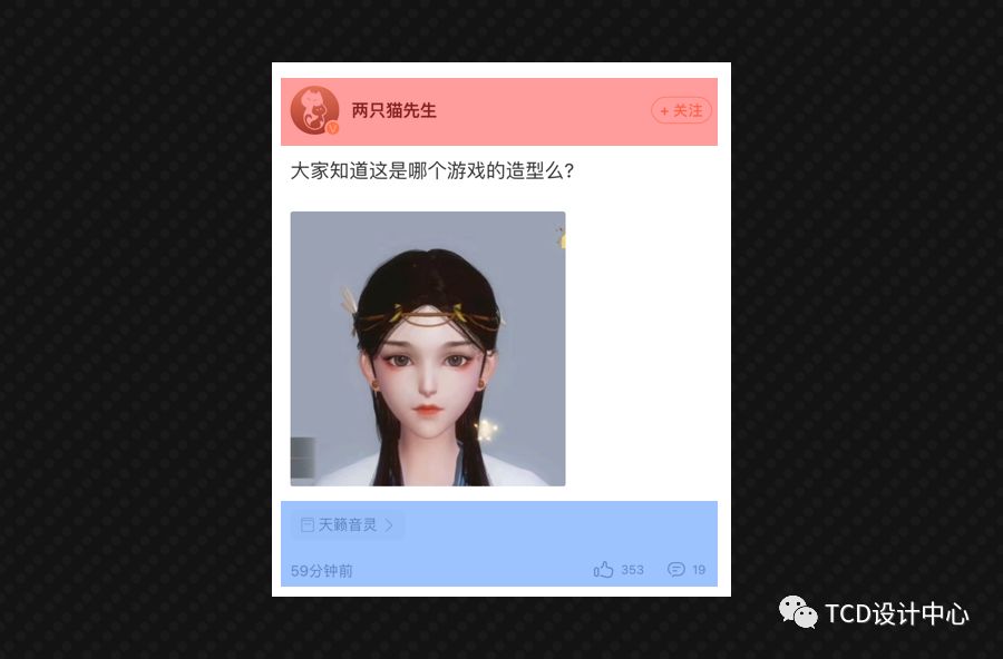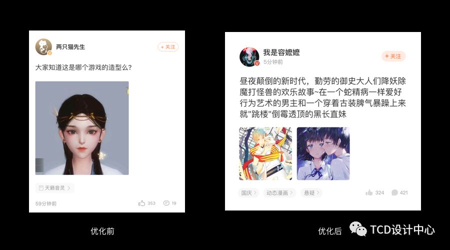 那何不把两部分内容重新整合,比如把时间和昵称放在一起,点赞评论和标签放在一起,这样就可以节省一行空间,移动端寸土寸金啊!