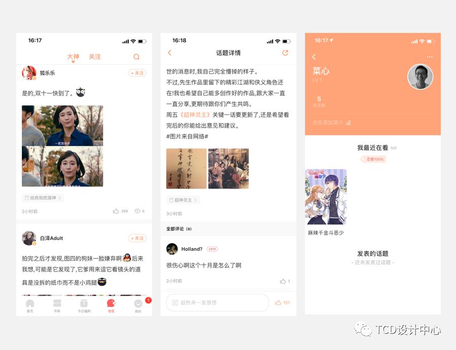 腾讯动漫app有一个社区模块,是推进粉丝、作者互动的地方,以前只有作者可以发帖,现在我们要对普通用户也开放权限,当然,这是功能上面的诉求,对于视觉方面,经过设计侧和产品侧的讨论,我们一致认为当前的页面不够活泼、好玩,与我们的目标用户定位不符,比如目前的部分页面如下: