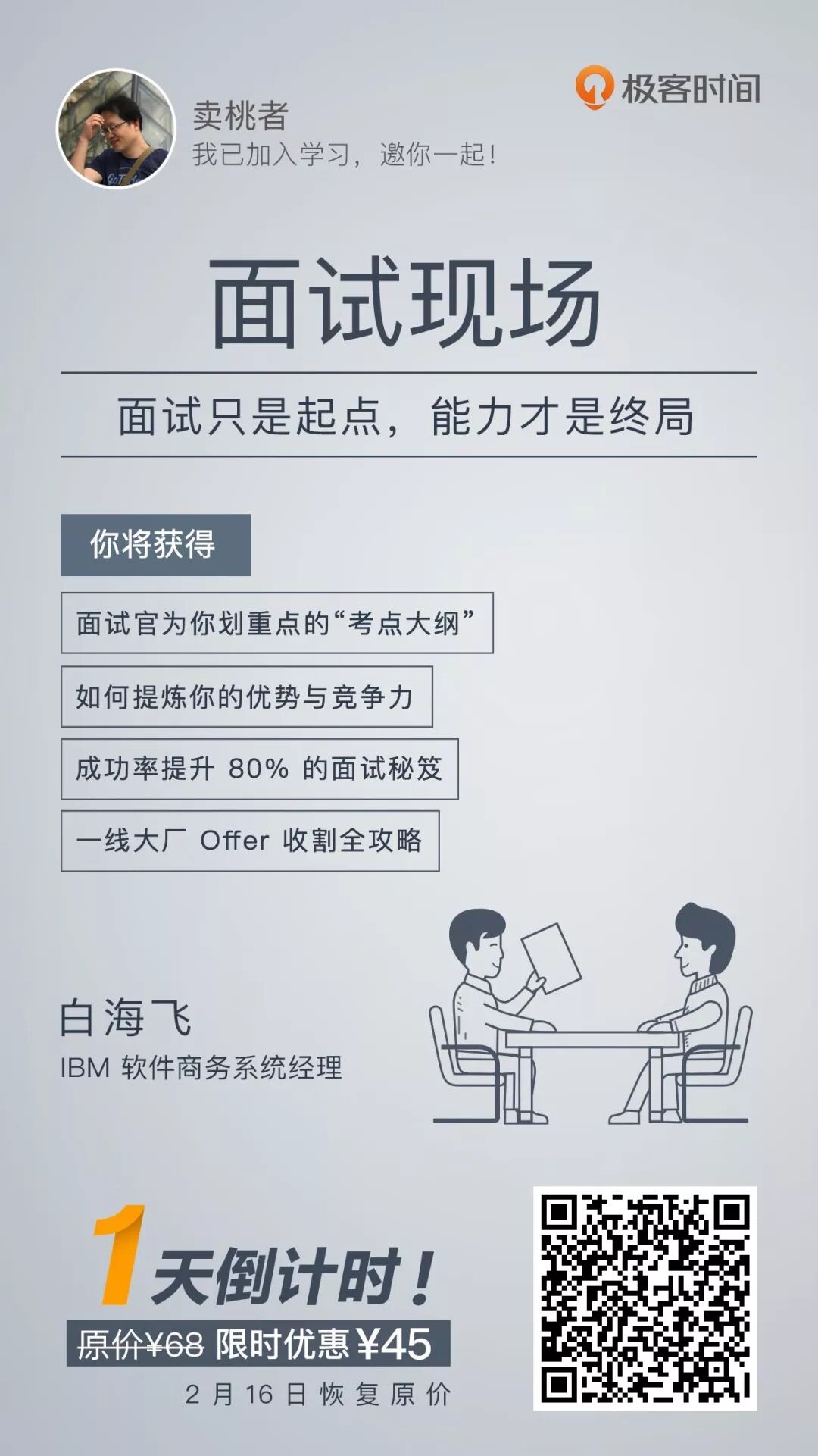 本文来自极客时间专栏《面试现场》,今天是优惠期最后一天,推荐给有需要的朋友。