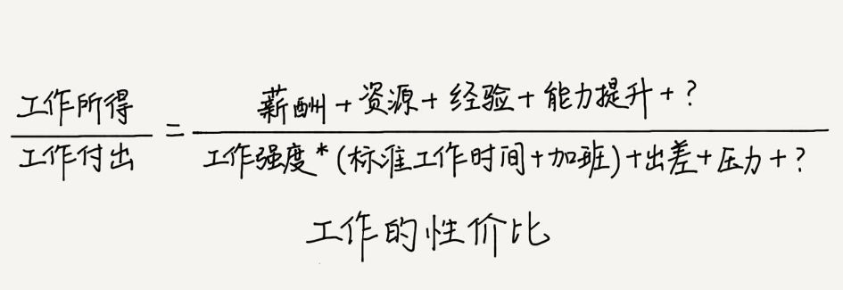 这个公式列出了工作所得和付出包含的一些细项(问号表示还可能有其他细项未考虑到)。工作所得包括了薪水、培训资源、工作资源、经验和能力提升等。工作付出包括工作强度、加班、出差等,而且,工作时段以外你承受的工作压力也要考虑进去。这样看,这个公式好复杂。是呀,其实我就是想告诉你,工作所得和工作付出都涉及诸多因素,只单单拎出“薪水”一项来比,是不合理的。