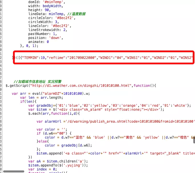 如果直接通过经纬度地址进行访问中国天气网通过分析可以在直接访问的地址中找到返回这个部分数据
