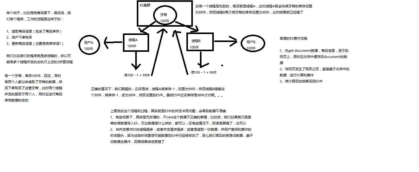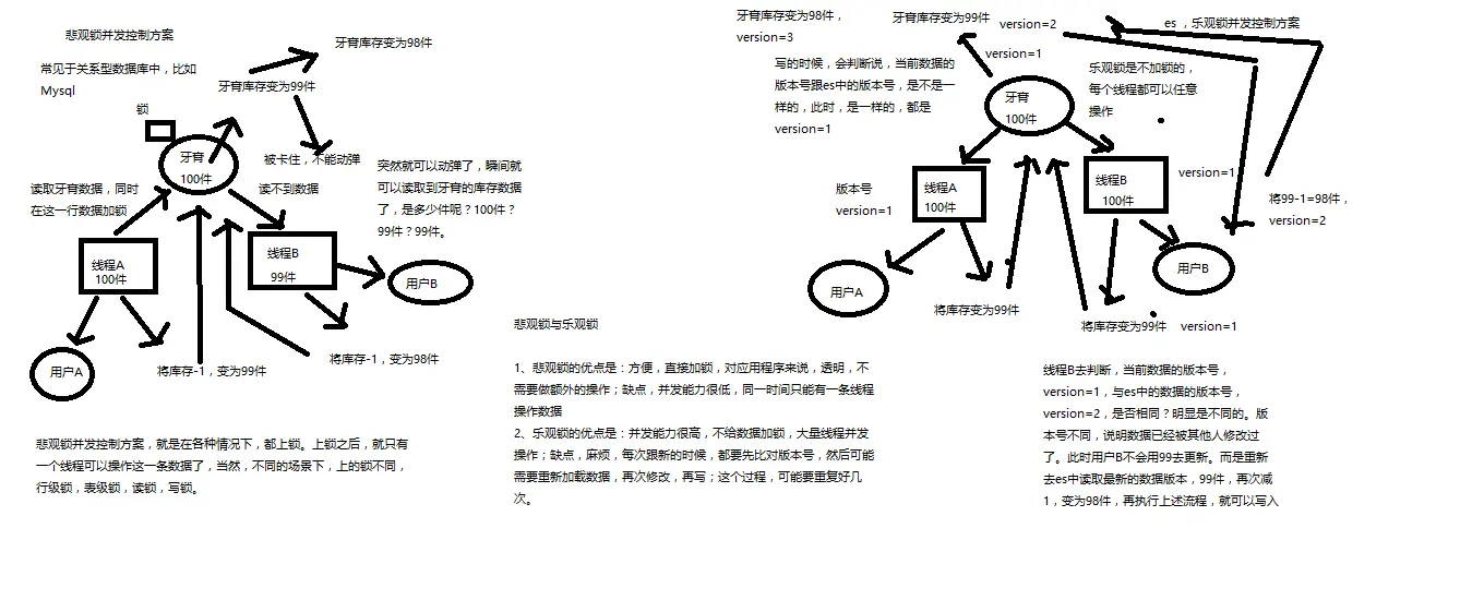 乐观锁不加锁,每个线程都可以任意操作。es的每条文档中有一个version字段,新建文档后为1,修改一次累加,线程A,B同时读取到数据,version=1,A处理完之后库存为99,在写入es的时候会跟es中的版本号比较,都是1,则写入成功,version=2,B处理完之后也为99,存入es时与es中的数据的版本号version=2相比,明显不同,此时不会用99去更新,而是重新读取最新的数据,再减一,变为98,执行上述操作,写入。