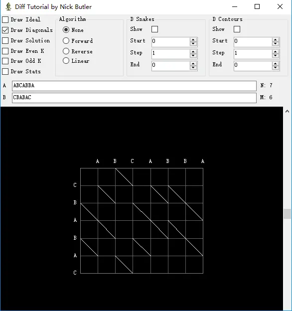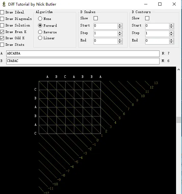 Investigating Myers' diff algorithm: Part 1 of 2文章是用C#写的,我这里将它简单改写称为Java。