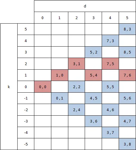 上面的代码寻找一条到达终点的snake。因为V数组里面存储的是在k line最新端点的坐标,所以为了寻找到所有的snake,我们在d的每次循环完毕之后,从d(Solution)遍历到0。如下: