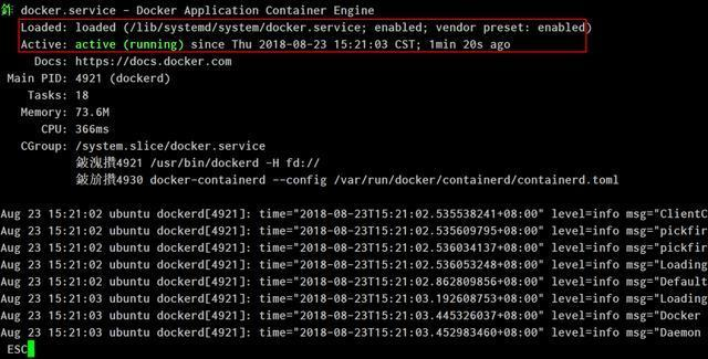 安装完毕后,可以看到Docker服务已经从/lib/systemd/system/docker.service启动了,dockerd进程id为4921: