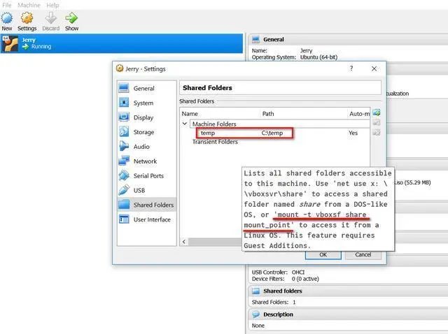 2. 假设我想将宿主操作系统里的文件夹temp共享给虚拟机里的Ubuntu,在Virtual Box的虚拟机设置里定义这个temp文件夹为共享文件夹。定义完之后,Virtual Box里弹出的Tooltip其实注明了如何进行下一步操作。