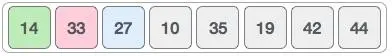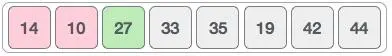 它将33与27交换。它还检查已排序子列表的所有元素。在这里,我们看到排序的子列表只有一个元素14,而27大于14.因此,排序的子列表在交换后仍然排序。