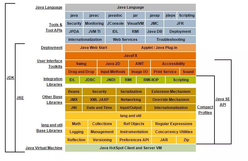 JRE(Java运行时环境):只有JVM,对于普通的Java开发者来说难度太高了,因此Hotspot的开发者还为普通开发者提供了对应的Java SE API和其他开发者需要的类库,这些API、类库和JVM共同构成了Java运行时环境。