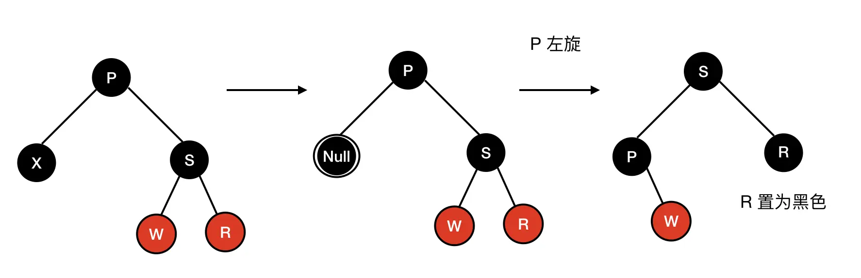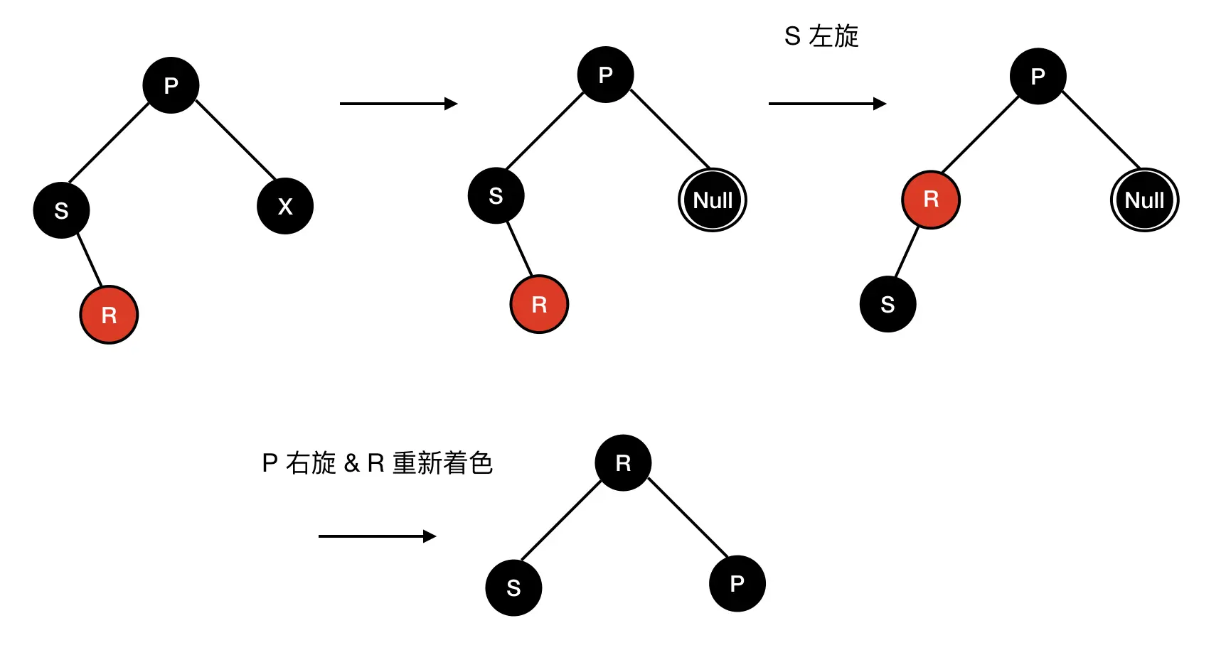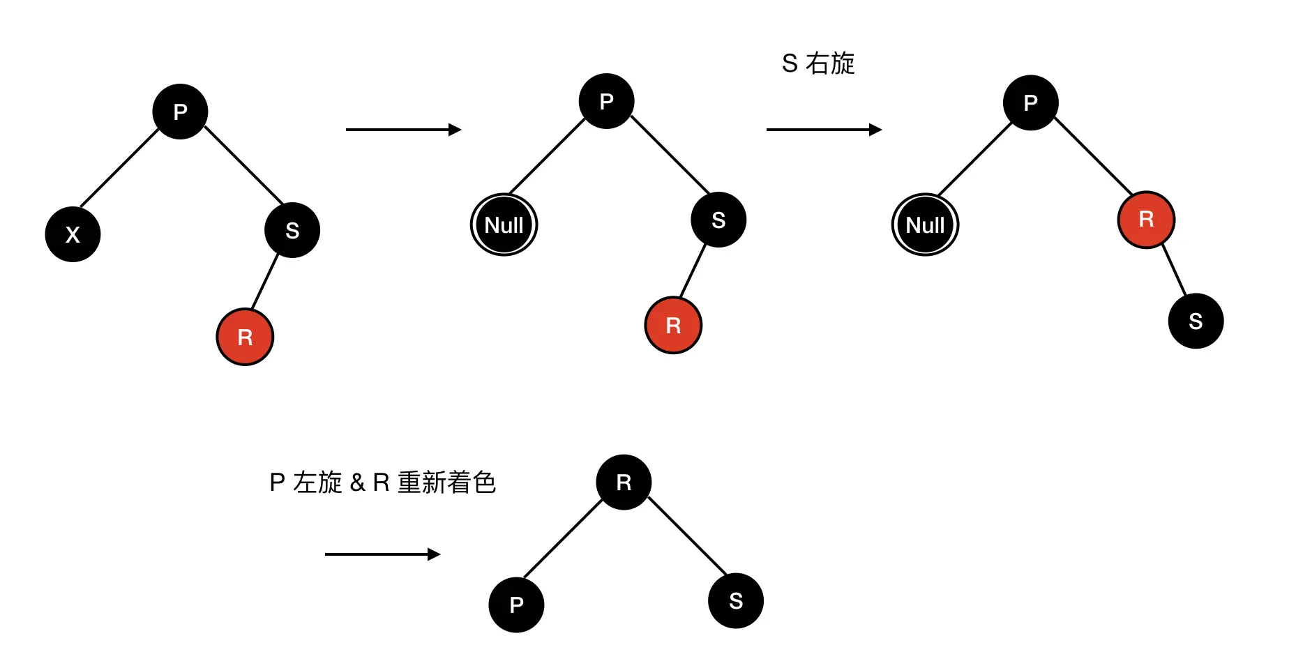 a) 兄弟 S 是黑色,S 的孩子至少有一个是红色 ,假设 R 是 S 的红色子节点,根据 R 和 S 的位置可以分为下面四种情况: