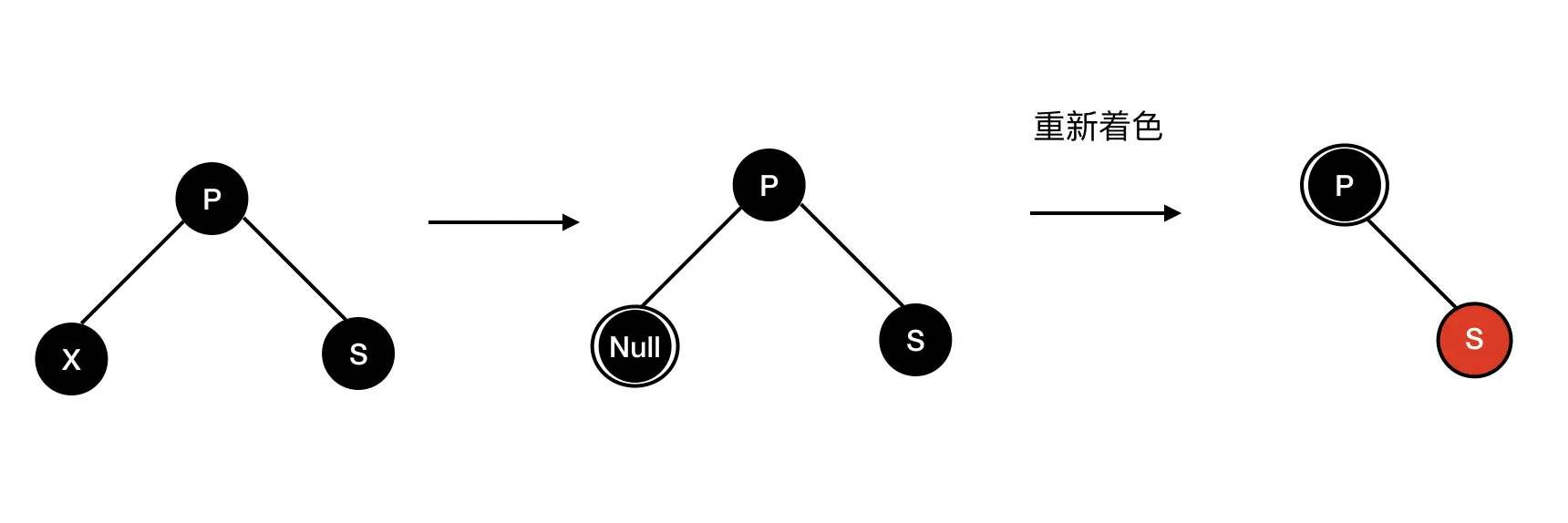 b) 兄弟 S 是黑色,S 的孩子都是黑色。解决方案:如果父节点为黑色,则置为双黑色,;如果父节点为红色,则置为黑色;S 置为红色;若根节点为双黑色时,置为黑色。