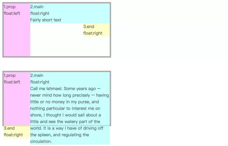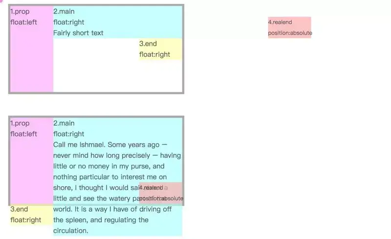 2. 如果浅蓝色盒子文本过多,高度超过了粉色盒子,则黄色盒子不会停留在右下方,而是掉到了粉色盒子下。