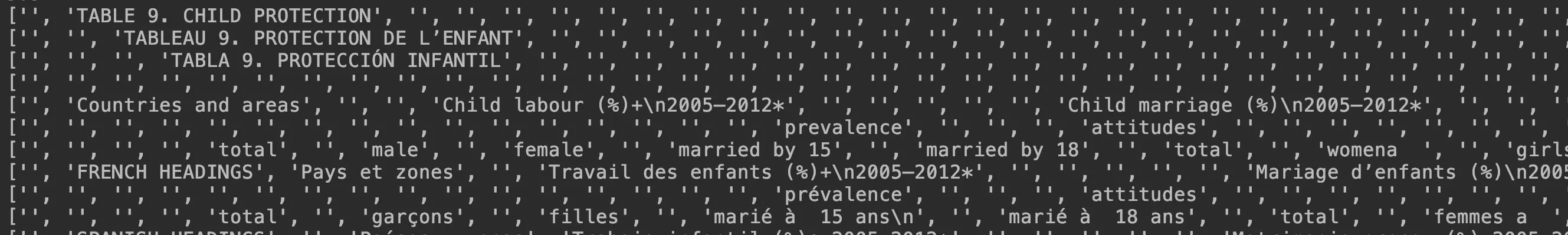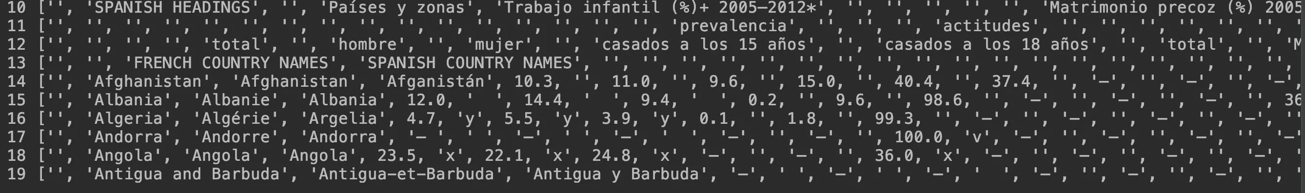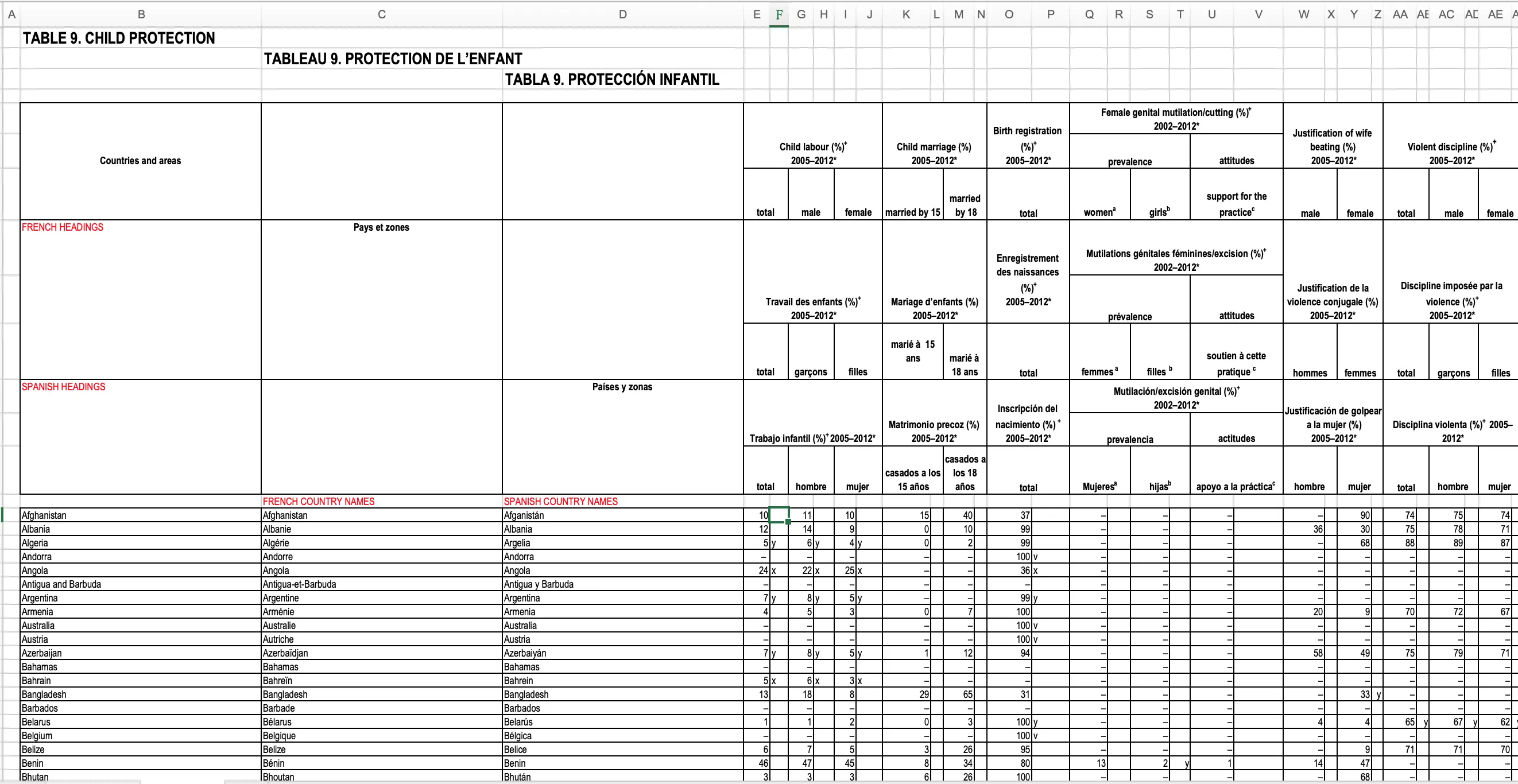 我们上面定义的格式是以国家为键,所以首先应该找到国家。观察 Excel 表格,从第15 行开始显示国家数据。Child labour 和 Child marriage 的数据从第E列到第N列。
