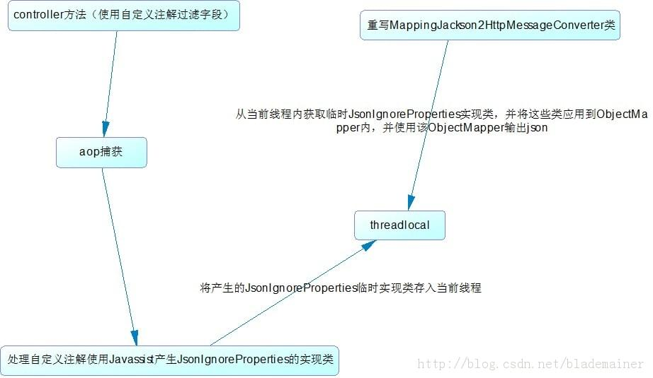 - filterProperties读取注解并根据自定义注解使用javassist创建JsonIgnoreProperties临时实现类(同时缓存到map内,下次可直接取出)并存入当前线程内(ThreadJacksonMixInHolder, 使用threadlocal实现),