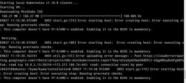 i042416@ubuntu:~/kyma/kyma/installation$ E0827 11:19:38.972489 3093 start.go:174] Error starting host: Error creating host: Error executing step: Running precreate checks.