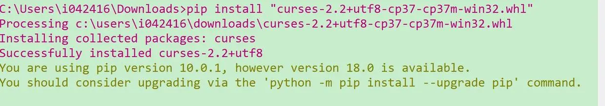 下载完毕后,使用pip install "curses-2.2+utf8-cp37-cp37m-win32.whl"进行安装,成功安装后问题解决。