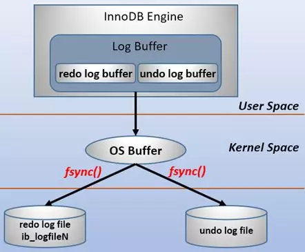 为了确保每次日志都能写入到事务日志文件中,在每次将 log buffer 中的日志写入日志文件的过程中都会调用一次操作系统的fsync操作(即fsync()系统调用)。因为 MariaDB/MySQL 是工作在用户空间的,MariaDB/MySQL 的 log buffer 处于用户空间的内存中。要写入到磁盘上的 log file 中(redo:ib_logfileN文件,undo:share tablespace或.ibd文件),中间还要经过操作系统内核空间的 OS buffer,调用fsync()的作用就是将 OS buffer 中的日志刷到磁盘上的 log file 中。